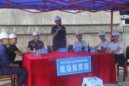 根據(jù)指令,公司應(yīng)急搶險(xiǎn)隊(duì)、遂寧化工應(yīng)急救援隊(duì)、射洪市消防救援大隊(duì)、射洪市應(yīng)急管理局、射洪市交警大隊(duì)、射洪市生態(tài)環(huán)境局、射洪市中醫(yī)院120急救中心、射洪市經(jīng)濟(jì)信息化和科學(xué)技術(shù)局、射洪市衛(wèi)生健康局等單位及時(shí)趕到現(xiàn)場(chǎng)并實(shí)施應(yīng)急救援。各搶險(xiǎn)救援隊(duì)伍在到達(dá)指定地點(diǎn)后,分別開展了人員疏散、環(huán)境監(jiān)測(cè)、液氨稀釋、廢水處置、輿情監(jiān)控、泄露搶險(xiǎn)、安置救助、傷員救治等科目的救援演練。